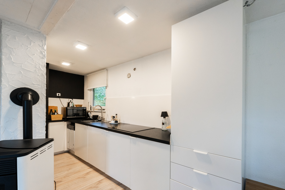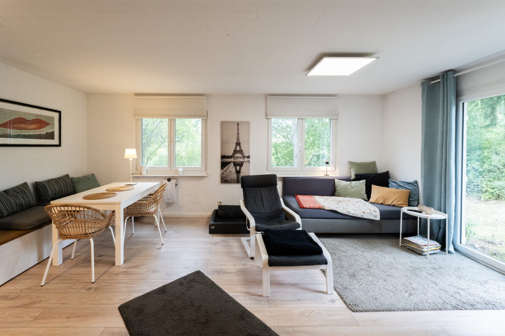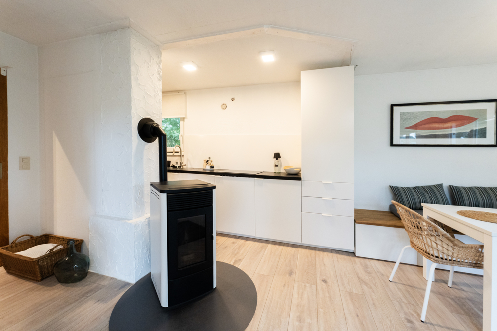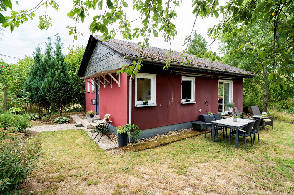 Umgeben von Bäumen und Feldern, lädt das Häuschen zum Entspannen ein. Die vielen Fenster und helle Einrichtung schaffen eine warme, natürliche Atmosphäre, in der man sofort zur Ruhe kommt. Der rote Anstrich der Fassade erinnert an gemütliche Schwedenhäuser.