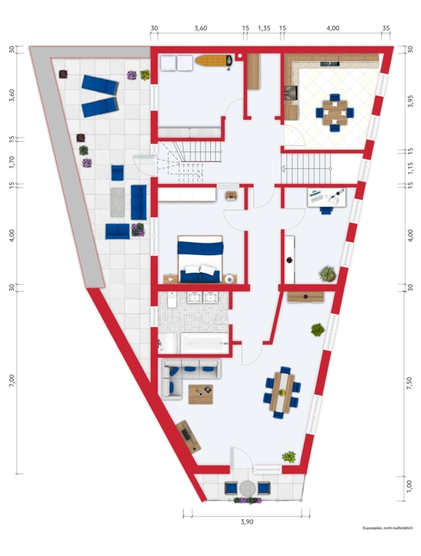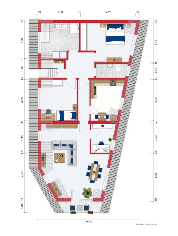 Die Wohnungen verfügen über eine solide Ausstattung, hell geflieste Tageslichtbäder mit Dusche und Badewanne in den großen Wohnungen. Die Böden sind überwiegend gefliest und teilweise mit Fußbodenheizung ausgestattet. Die Dachgeschosswohnung hat einen eigenen Eingang und einen kleinen Balkon, die Erdgeschosswohnung einen Balkon und eine große Terrasse.