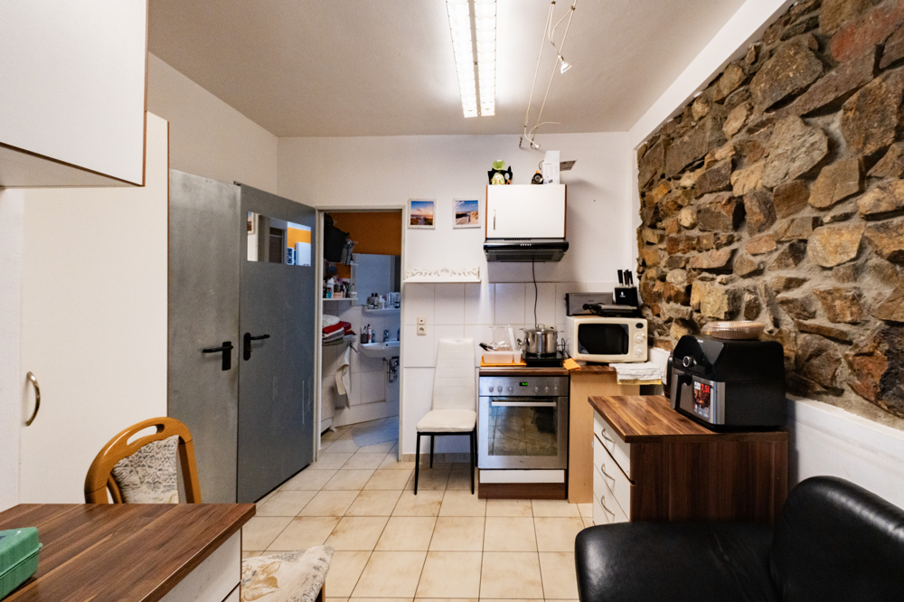 Eingang, Einzimmerwohnung (ca. 39,90 m²) mit Küche, Bad und Abstellraum, Garage mit Werkstatt und Kellerräumen sowie Heizungsraum.