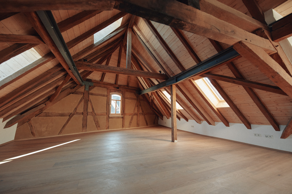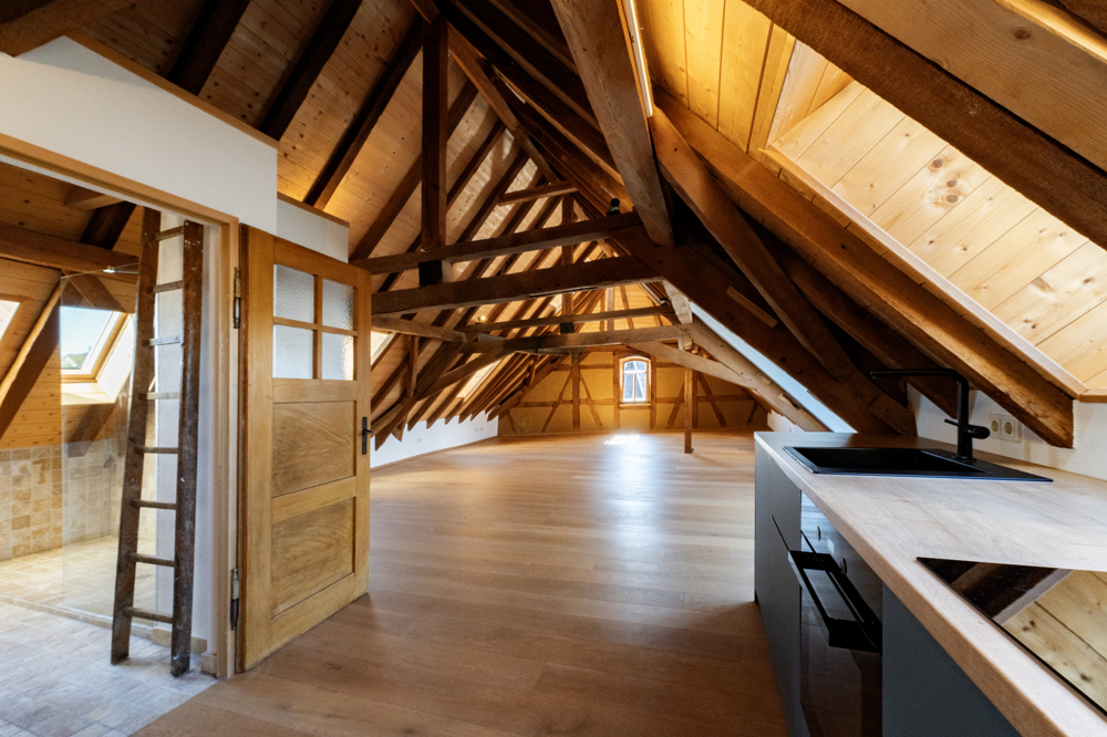 Die sichtbaren Holzbalken verleihen der modernen Ausstattung einen warmen, gemütlichen Charakter bis unters Dach. Das großzügige Studio bietet genügend Raum, um verschiedene Wohnbereiche einzurichten